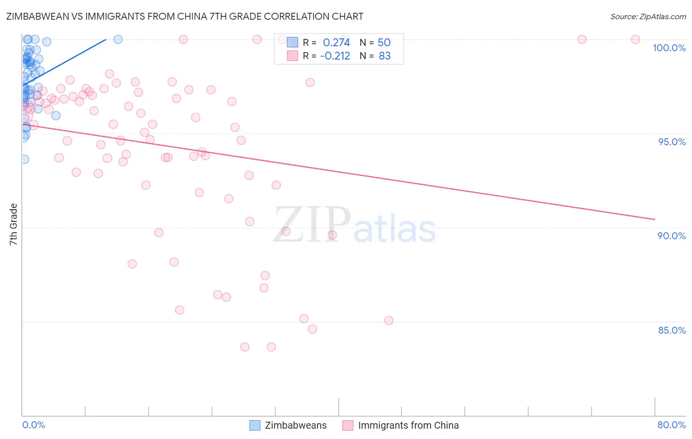 Zimbabwean vs Immigrants from China 7th Grade Correlation Chart
