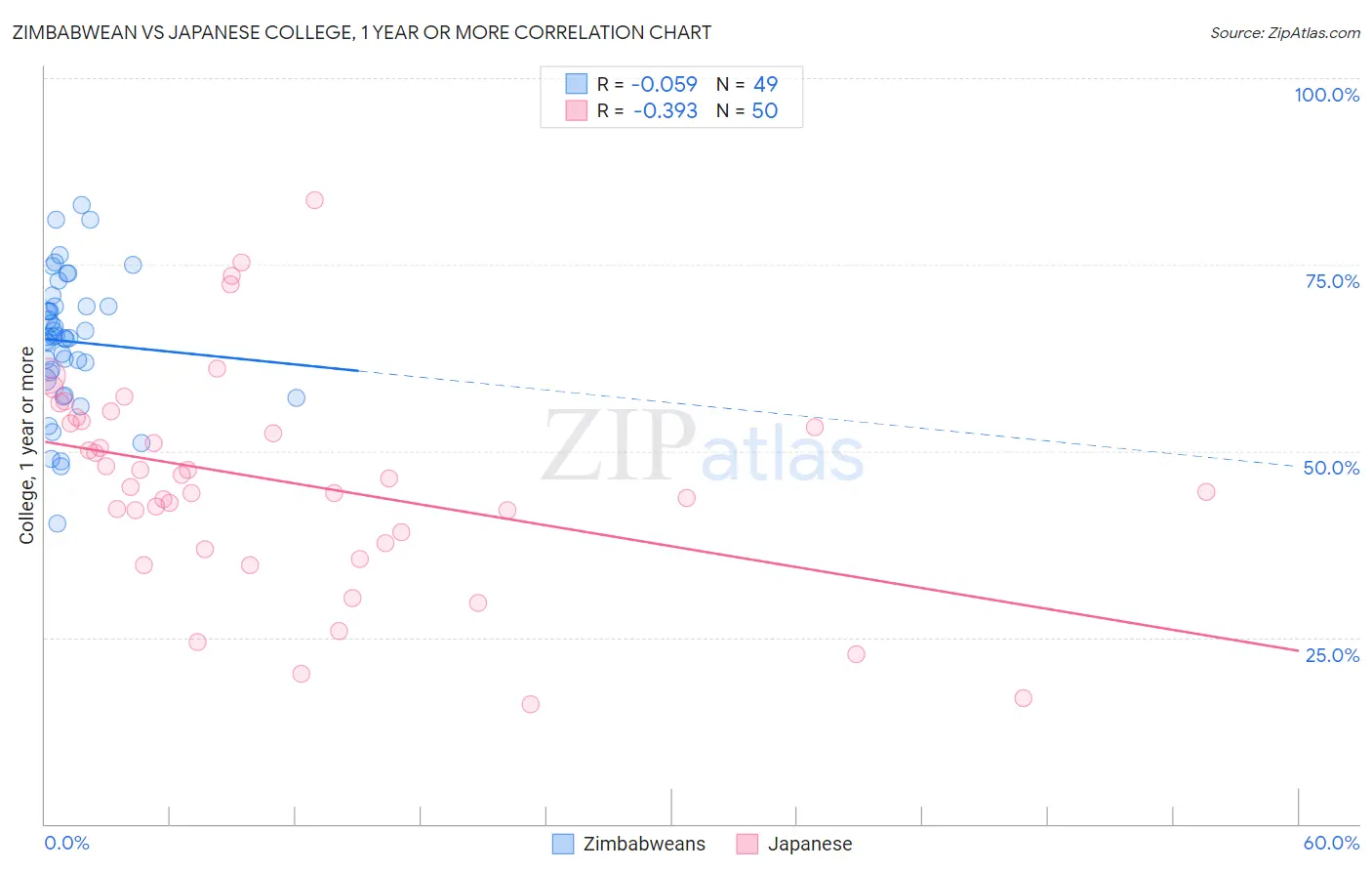 Zimbabwean vs Japanese College, 1 year or more Correlation Chart