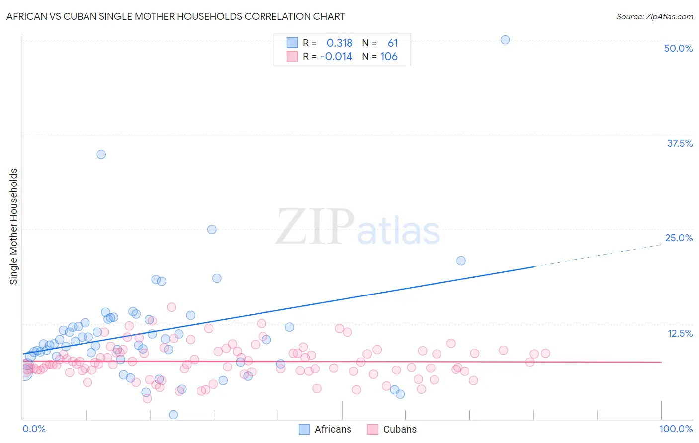 The statistical analysis conducted on geographies consisting of 468,558,446 people shows a mild positive correlation between the proportion of Africans and percentage of single mother households in the United States with a correlation coefficient (R) of 0.318 and weighted average of 8.2%. Similarly, the statistical analysis conducted on geographies consisting of 447,599,583 people shows no correlation between the proportion of Cubans and percentage of single mother households in the United States with a correlation coefficient (R) of -0.014 and weighted average of 7.2%, a difference of 13.5%.