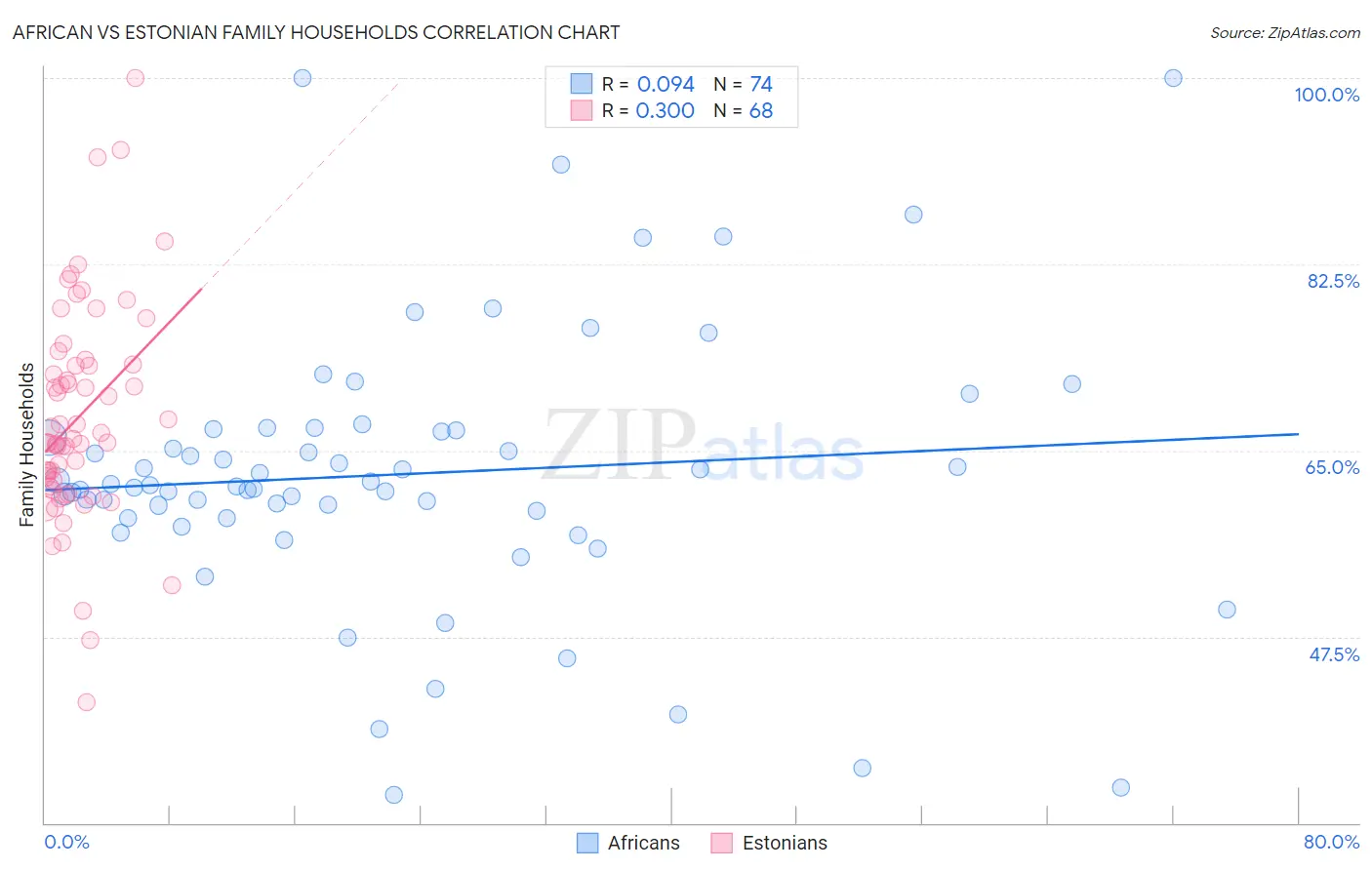 The statistical analysis conducted on geographies consisting of 469,598,671 people shows a slight positive correlation between the proportion of Africans and percentage of family households in the United States with a correlation coefficient (R) of 0.094 and weighted average of 62.1%. Similarly, the statistical analysis conducted on geographies consisting of 123,500,742 people shows a weak positive correlation between the proportion of Estonians and percentage of family households in the United States with a correlation coefficient (R) of 0.300 and weighted average of 62.9%, a difference of 1.2%.