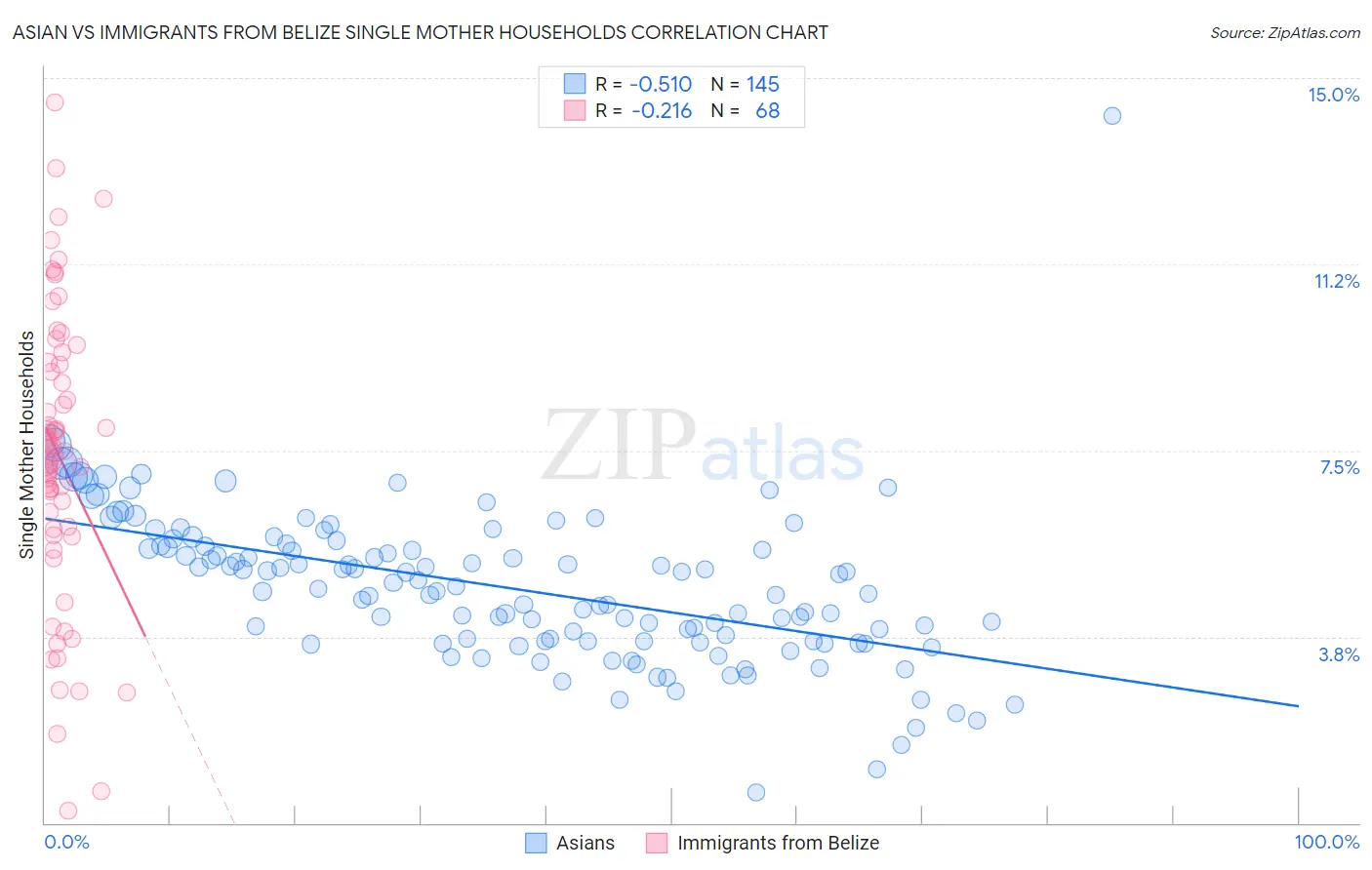 Asian vs Immigrants from Belize Single Mother Households Correlation Chart