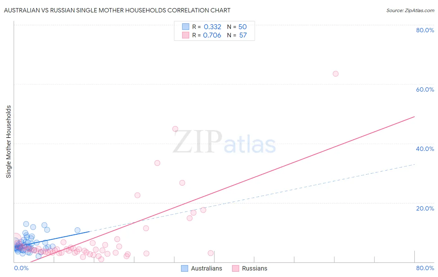 The statistical analysis conducted on geographies consisting of 223,630,517 people shows a mild positive correlation between the proportion of Australians and percentage of single mother households in the United States with a correlation coefficient (R) of 0.332 and weighted average of 5.6%. Similarly, the statistical analysis conducted on geographies consisting of 509,106,631 people shows a strong positive correlation between the proportion of Russians and percentage of single mother households in the United States with a correlation coefficient (R) of 0.706 and weighted average of 5.3%, a difference of 5.4%.