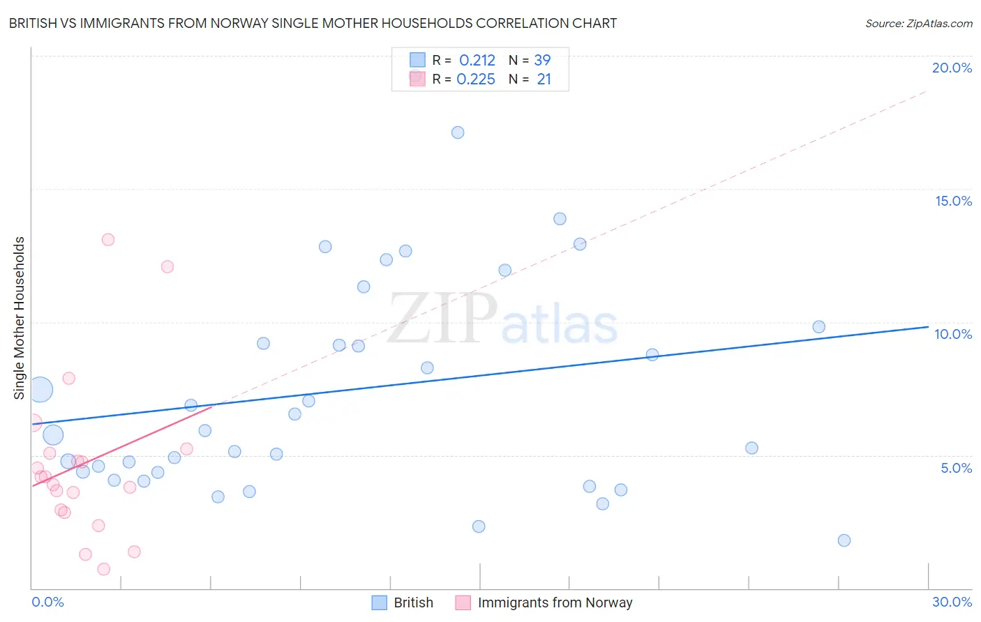 British vs Immigrants from Norway Single Mother Households Correlation Chart