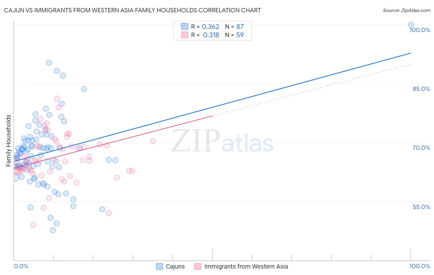 Cajun vs Immigrants from Western Asia Family Households Correlation Chart