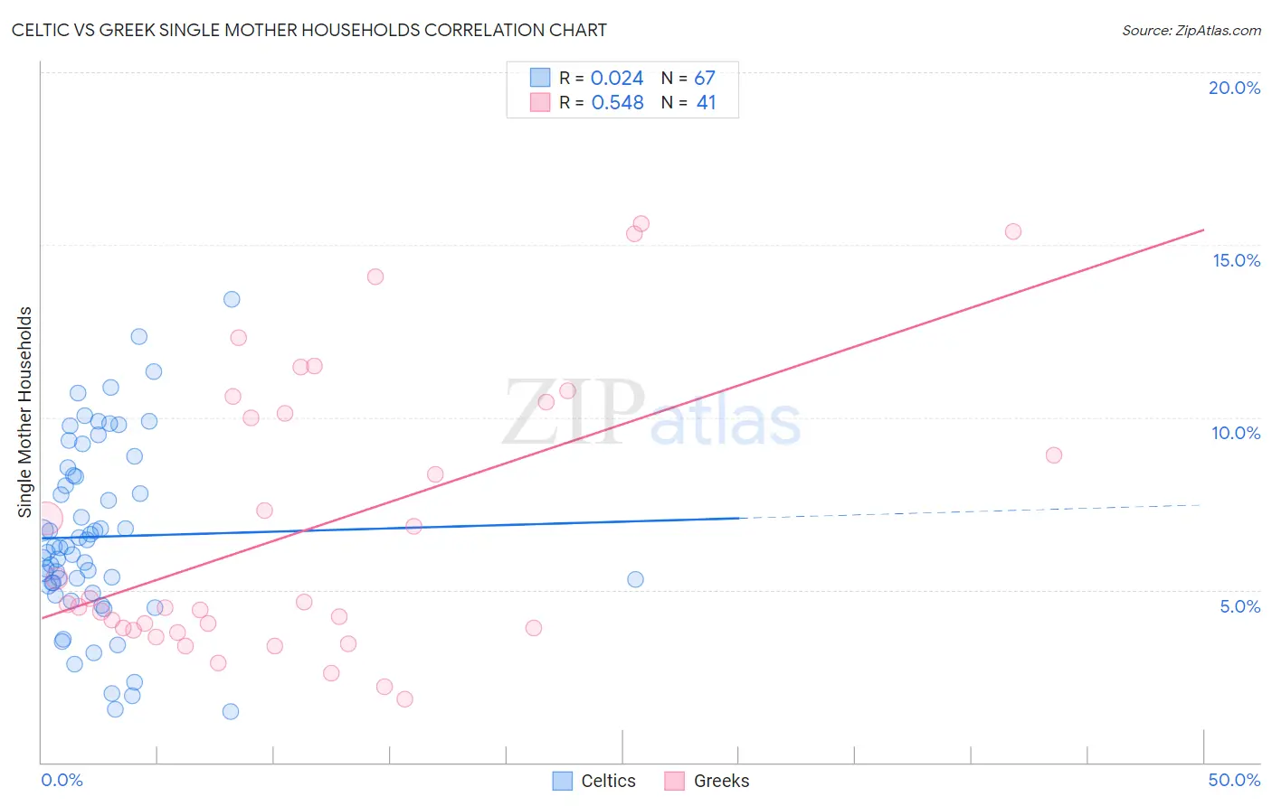 The statistical analysis conducted on geographies consisting of 168,688,619 people shows no correlation between the proportion of Celtics and percentage of single mother households in the United States with a correlation coefficient (R) of 0.024 and weighted average of 6.1%. Similarly, the statistical analysis conducted on geographies consisting of 480,310,145 people shows a substantial positive correlation between the proportion of Greeks and percentage of single mother households in the United States with a correlation coefficient (R) of 0.548 and weighted average of 5.6%, a difference of 10.0%.
