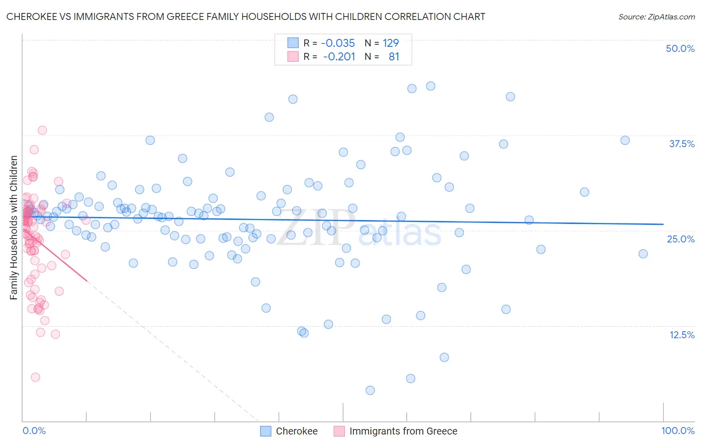 The statistical analysis conducted on geographies consisting of 493,173,855 people shows no correlation between the proportion of Cherokee and percentage of family households with children in the United States with a correlation coefficient (R) of -0.035 and weighted average of 27.5%. Similarly, the statistical analysis conducted on geographies consisting of 216,757,437 people shows a weak negative correlation between the proportion of Immigrants from Greece and percentage of family households with children in the United States with a correlation coefficient (R) of -0.201 and weighted average of 26.0%, a difference of 5.6%.