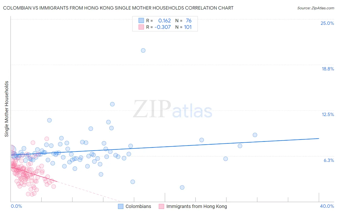Colombian vs Immigrants from Hong Kong Single Mother Households Correlation Chart