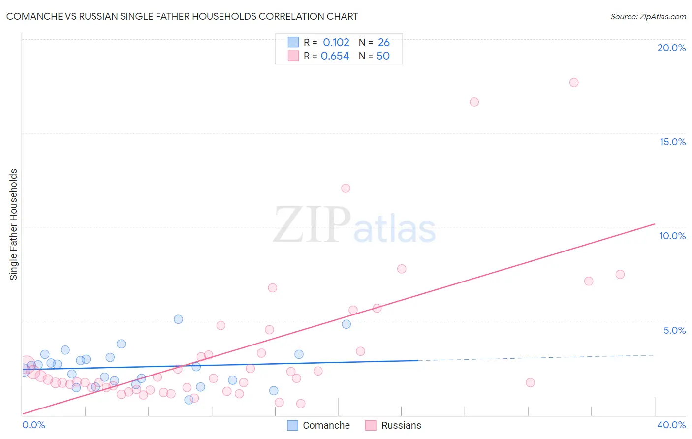 The statistical analysis conducted on geographies consisting of 109,445,833 people shows a poor positive correlation between the proportion of Comanche and percentage of single father households in the United States with a correlation coefficient (R) of 0.102 and weighted average of 2.5%. Similarly, the statistical analysis conducted on geographies consisting of 503,310,659 people shows a significant positive correlation between the proportion of Russians and percentage of single father households in the United States with a correlation coefficient (R) of 0.654 and weighted average of 2.0%, a difference of 26.3%.