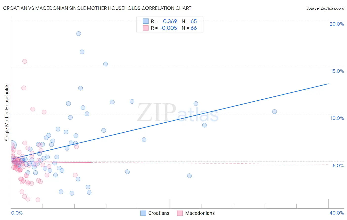 The statistical analysis conducted on geographies consisting of 374,465,881 people shows a mild positive correlation between the proportion of Croatians and percentage of single mother households in the United States with a correlation coefficient (R) of 0.369 and weighted average of 5.5%. Similarly, the statistical analysis conducted on geographies consisting of 132,446,504 people shows no correlation between the proportion of Macedonians and percentage of single mother households in the United States with a correlation coefficient (R) of -0.005 and weighted average of 5.4%, a difference of 1.1%.