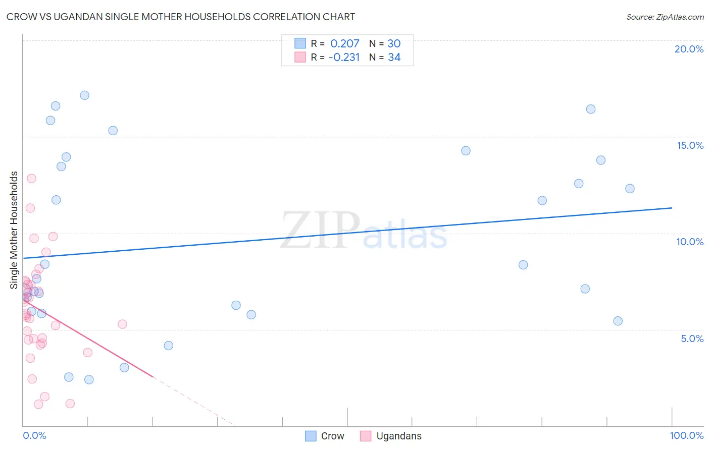 The statistical analysis conducted on geographies consisting of 59,176,023 people shows a weak positive correlation between the proportion of Crow and percentage of single mother households in the United States with a correlation coefficient (R) of 0.207 and weighted average of 7.4%. Similarly, the statistical analysis conducted on geographies consisting of 93,972,955 people shows a weak negative correlation between the proportion of Ugandans and percentage of single mother households in the United States with a correlation coefficient (R) of -0.231 and weighted average of 6.5%, a difference of 14.7%.