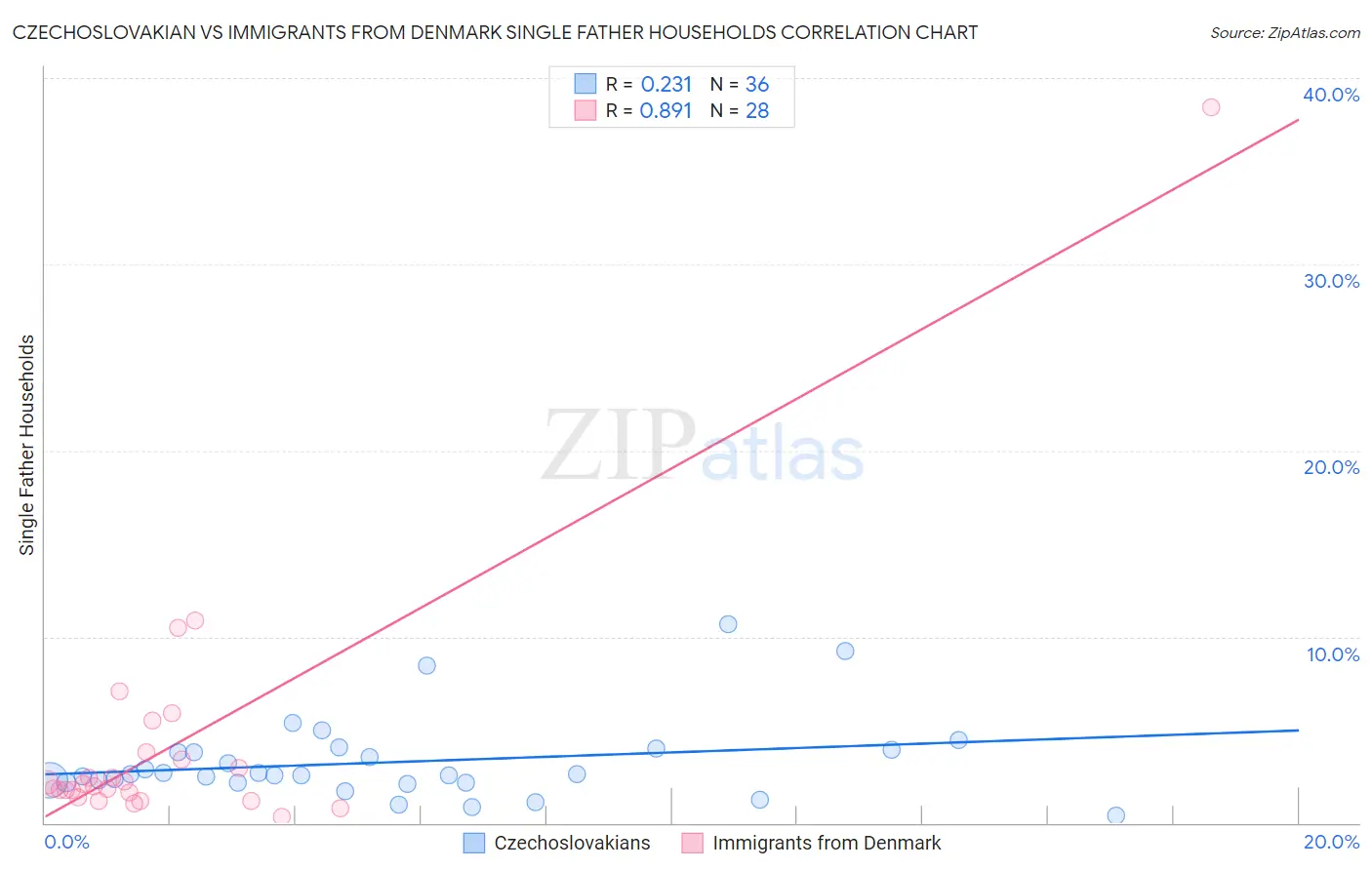 Czechoslovakian vs Immigrants from Denmark Single Father Households Correlation Chart