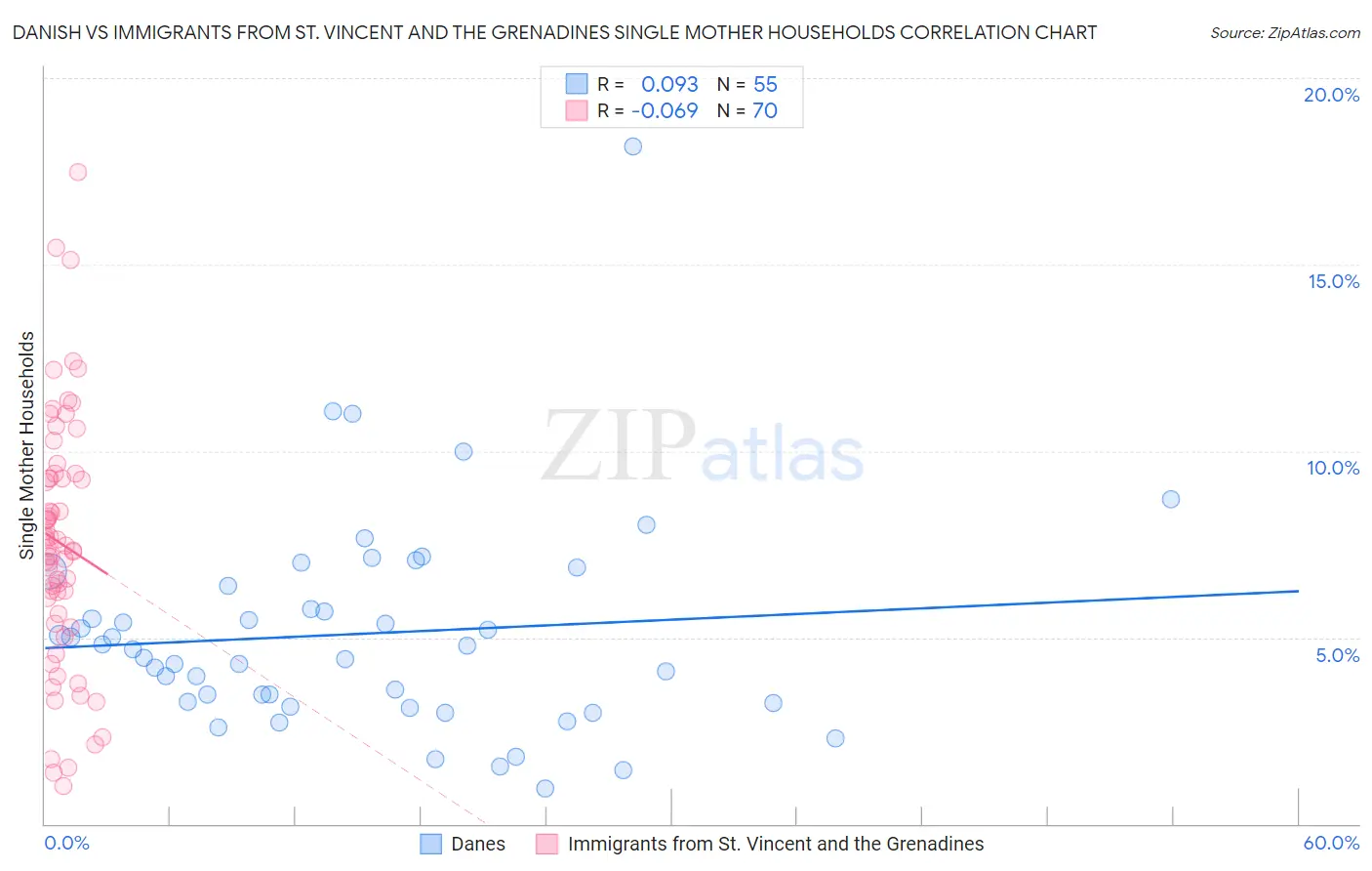 Danish vs Immigrants from St. Vincent and the Grenadines Single Mother Households Correlation Chart
