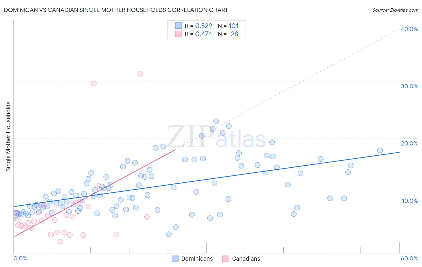 Dominican vs Canadian Single Mother Households Correlation Chart