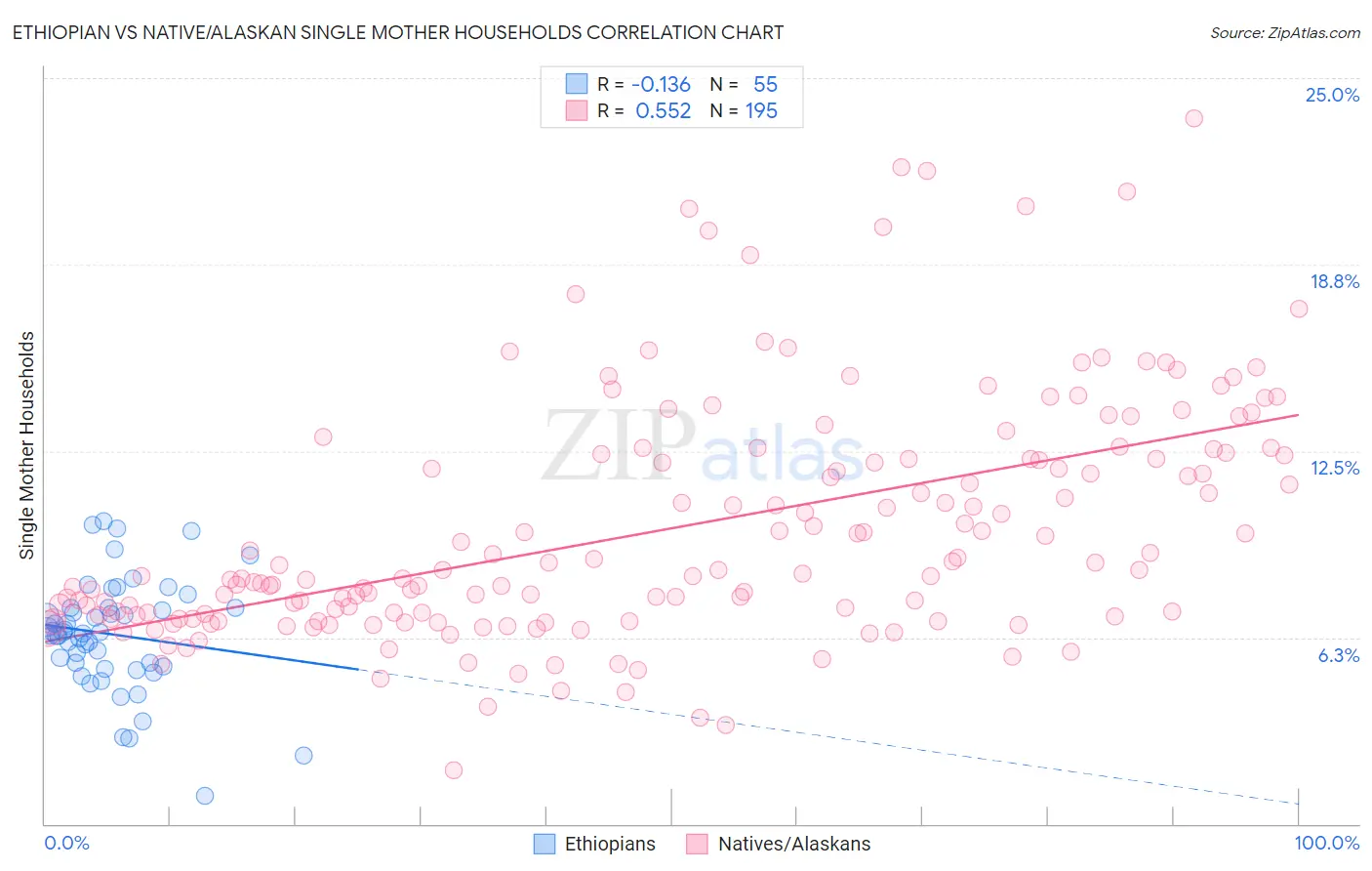 Ethiopian vs Native/Alaskan Single Mother Households Correlation Chart