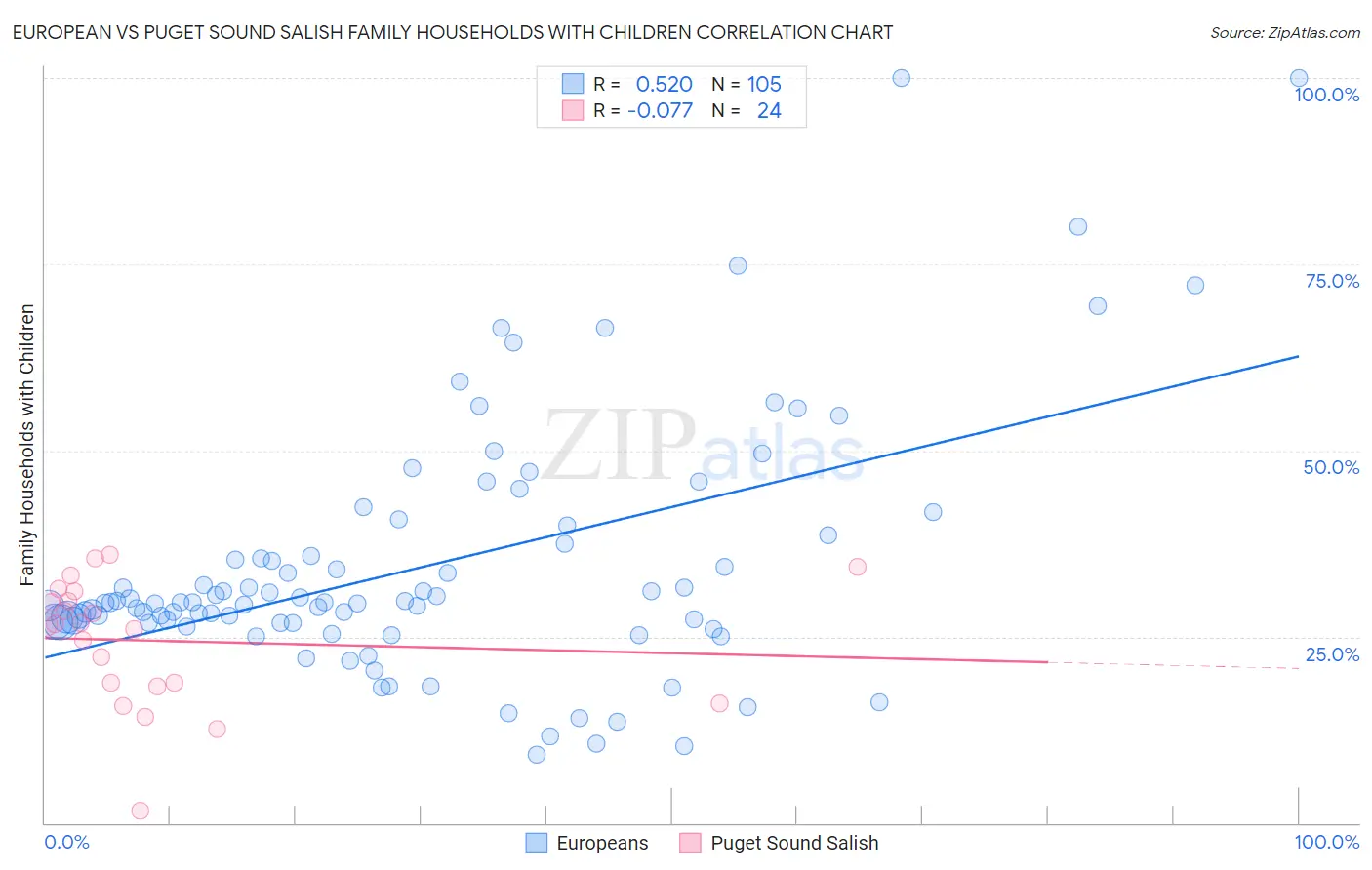 The statistical analysis conducted on geographies consisting of 560,876,859 people shows a substantial positive correlation between the proportion of Europeans and percentage of family households with children in the United States with a correlation coefficient (R) of 0.520 and weighted average of 27.9%. Similarly, the statistical analysis conducted on geographies consisting of 46,155,538 people shows a slight negative correlation between the proportion of Puget Sound Salish and percentage of family households with children in the United States with a correlation coefficient (R) of -0.077 and weighted average of 27.4%, a difference of 1.8%.