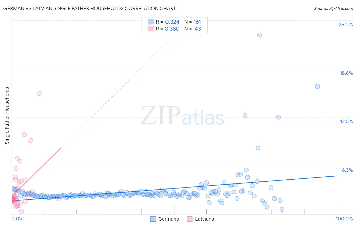 The statistical analysis conducted on geographies consisting of 562,897,212 people shows a mild positive correlation between the proportion of Germans and percentage of single father households in the United States with a correlation coefficient (R) of 0.324 and weighted average of 2.4%. Similarly, the statistical analysis conducted on geographies consisting of 219,307,286 people shows a mild positive correlation between the proportion of Latvians and percentage of single father households in the United States with a correlation coefficient (R) of 0.380 and weighted average of 2.0%, a difference of 18.6%.