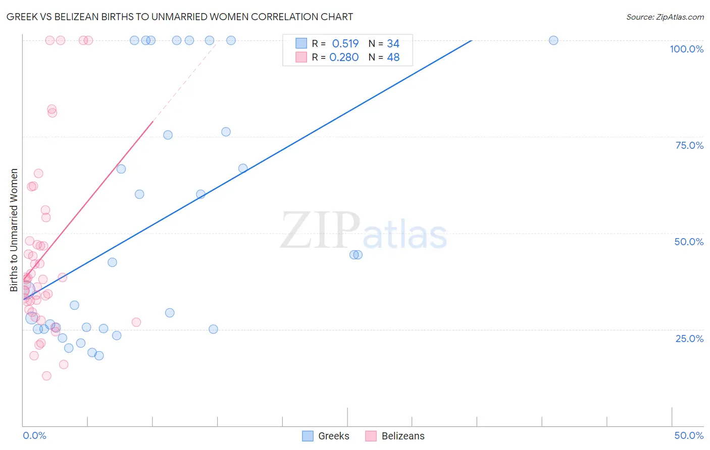 Greek vs Belizean Births to Unmarried Women Correlation Chart