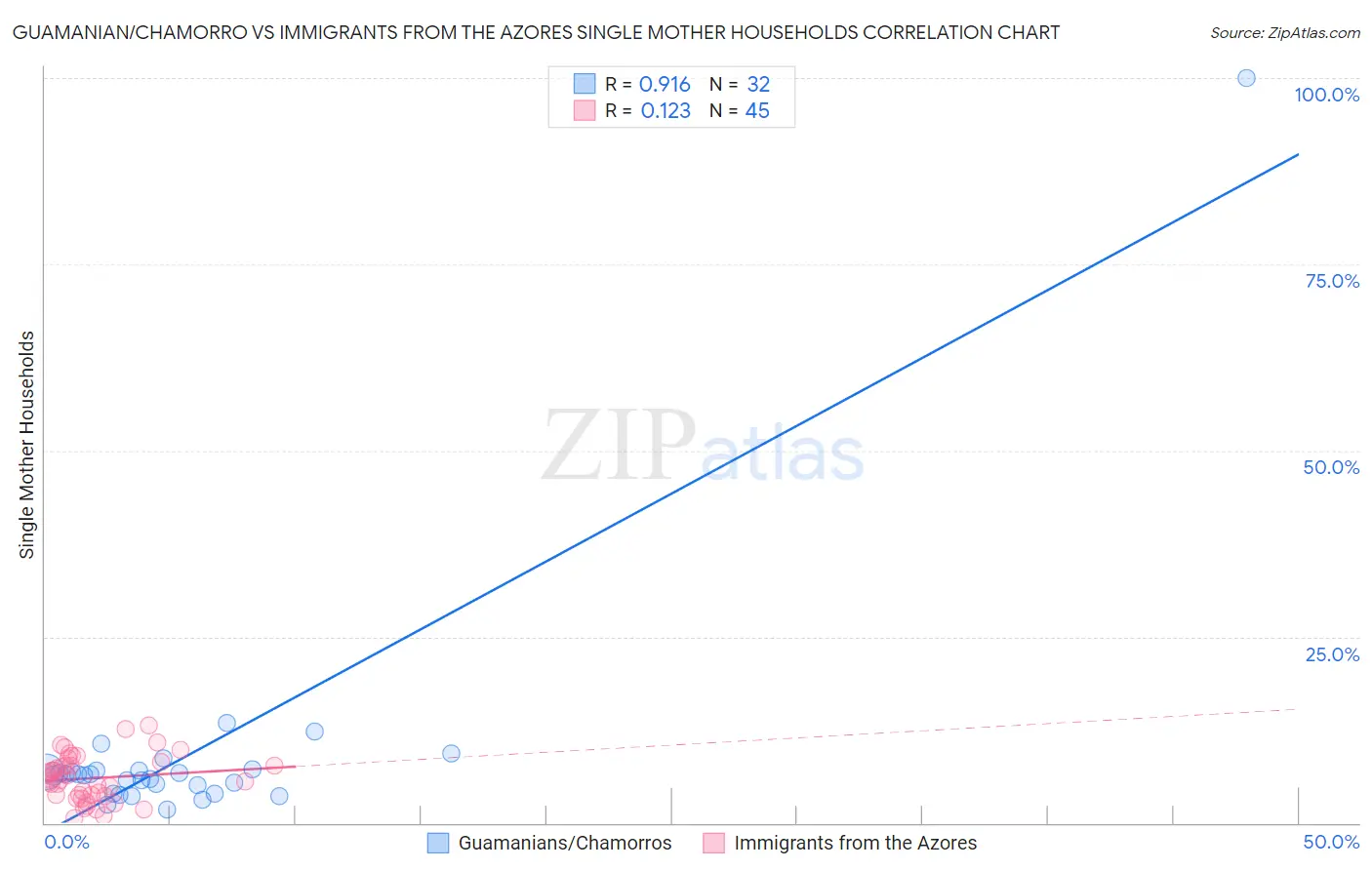 Guamanian/Chamorro vs Immigrants from the Azores Single Mother Households Correlation Chart