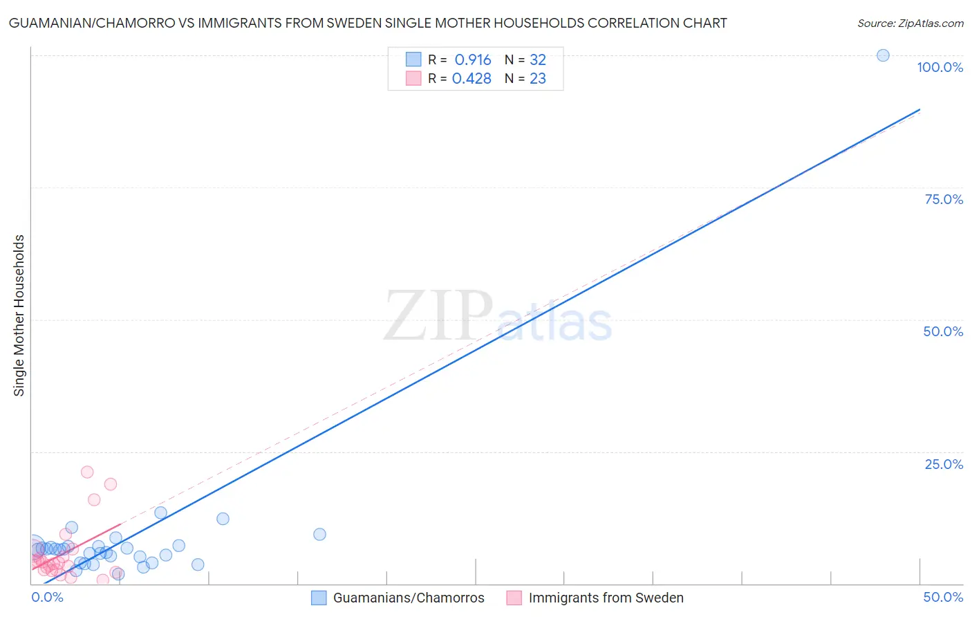 Guamanian/Chamorro vs Immigrants from Sweden Single Mother Households Correlation Chart