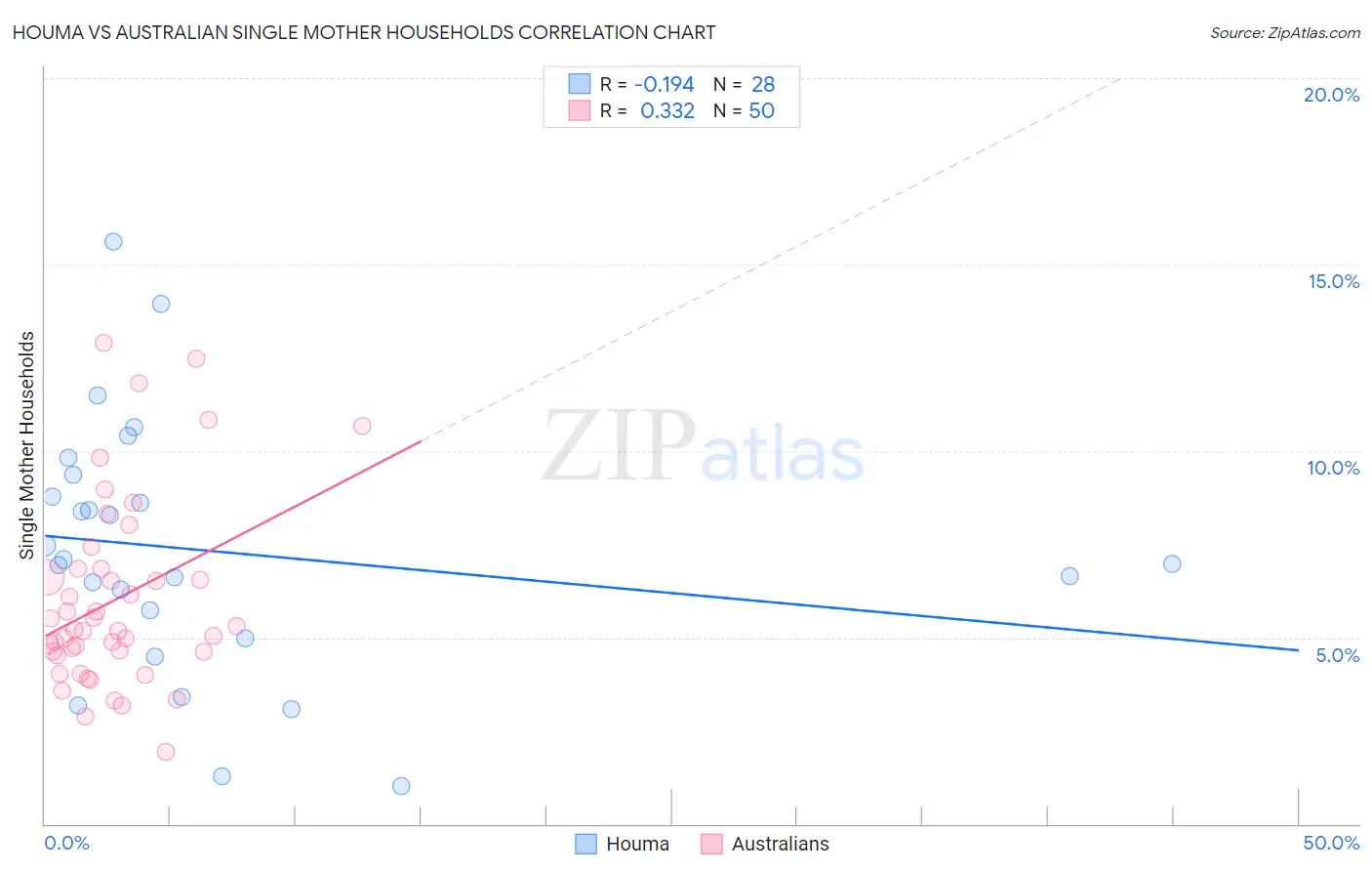 The statistical analysis conducted on geographies consisting of 36,776,416 people shows a poor negative correlation between the proportion of Houma and percentage of single mother households in the United States with a correlation coefficient (R) of -0.194 and weighted average of 7.9%. Similarly, the statistical analysis conducted on geographies consisting of 223,630,517 people shows a mild positive correlation between the proportion of Australians and percentage of single mother households in the United States with a correlation coefficient (R) of 0.332 and weighted average of 5.6%, a difference of 42.3%.