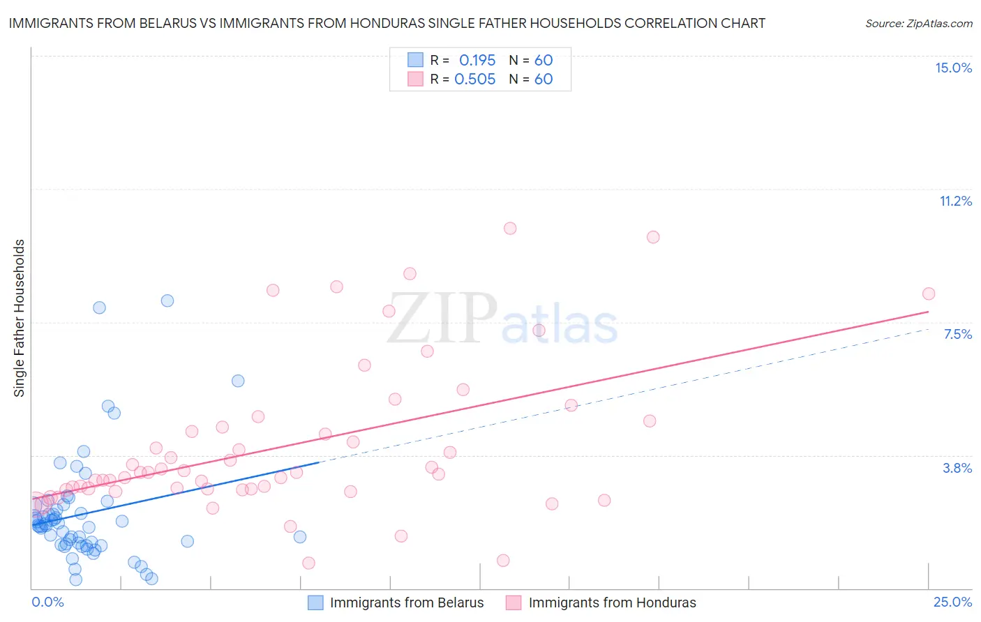 The statistical analysis conducted on geographies consisting of 149,894,019 people shows a poor positive correlation between the proportion of Immigrants from Belarus and percentage of single father households in the United States with a correlation coefficient (R) of 0.195 and weighted average of 1.9%. Similarly, the statistical analysis conducted on geographies consisting of 320,953,127 people shows a substantial positive correlation between the proportion of Immigrants from Honduras and percentage of single father households in the United States with a correlation coefficient (R) of 0.505 and weighted average of 2.8%, a difference of 51.0%.