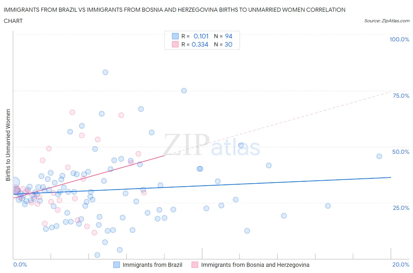 Immigrants from Brazil vs Immigrants from Bosnia and Herzegovina Births to Unmarried Women Correlation Chart