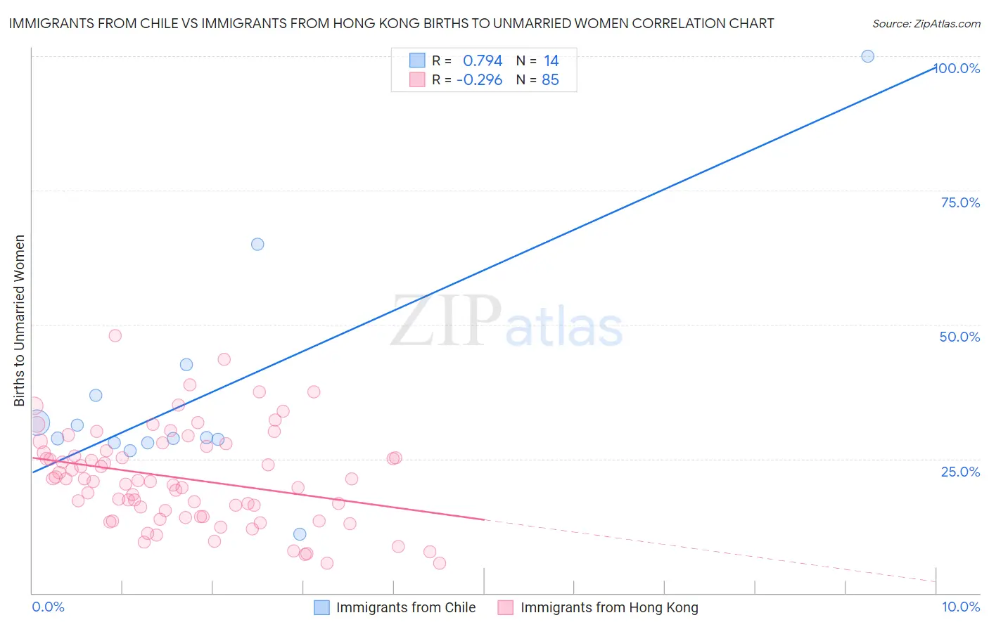Immigrants from Chile vs Immigrants from Hong Kong Births to Unmarried Women Correlation Chart