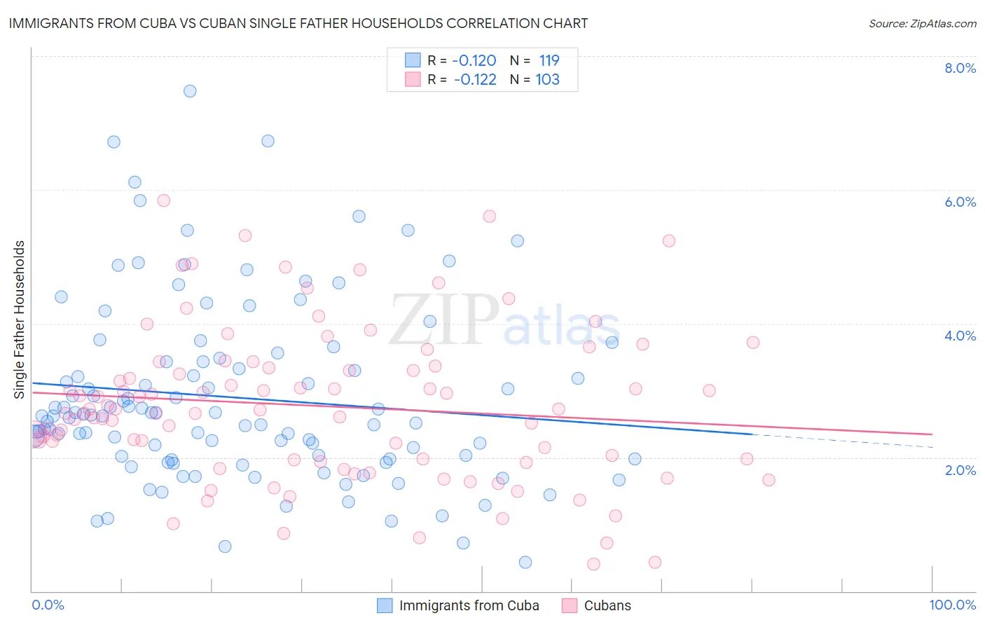 The statistical analysis conducted on geographies consisting of 323,764,180 people shows a poor negative correlation between the proportion of Immigrants from Cuba and percentage of single father households in the United States with a correlation coefficient (R) of -0.120 and weighted average of 2.7%. Similarly, the statistical analysis conducted on geographies consisting of 444,378,615 people shows a poor negative correlation between the proportion of Cubans and percentage of single father households in the United States with a correlation coefficient (R) of -0.122 and weighted average of 2.6%, a difference of 2.8%.