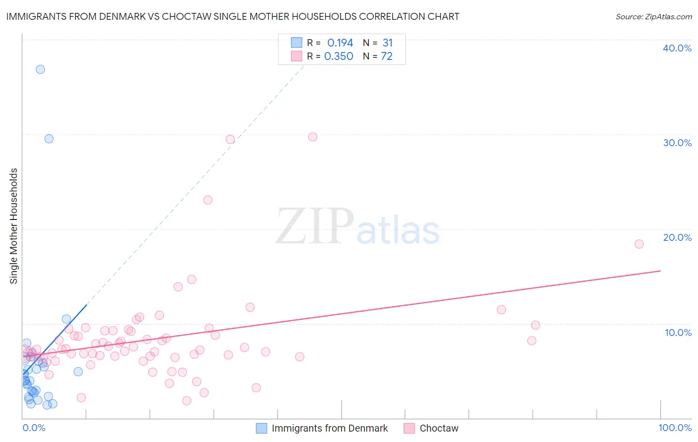 Immigrants from Denmark vs Choctaw Single Mother Households Correlation Chart