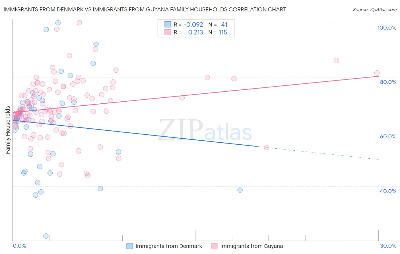 Immigrants from Denmark vs Immigrants from Guyana Family Households Correlation Chart