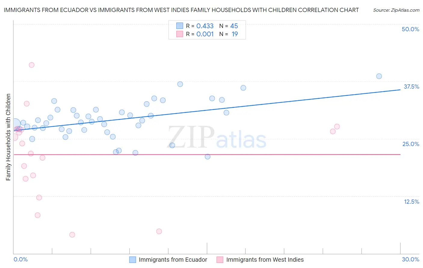 Immigrants from Ecuador vs Immigrants from West Indies Family Households with Children Correlation Chart