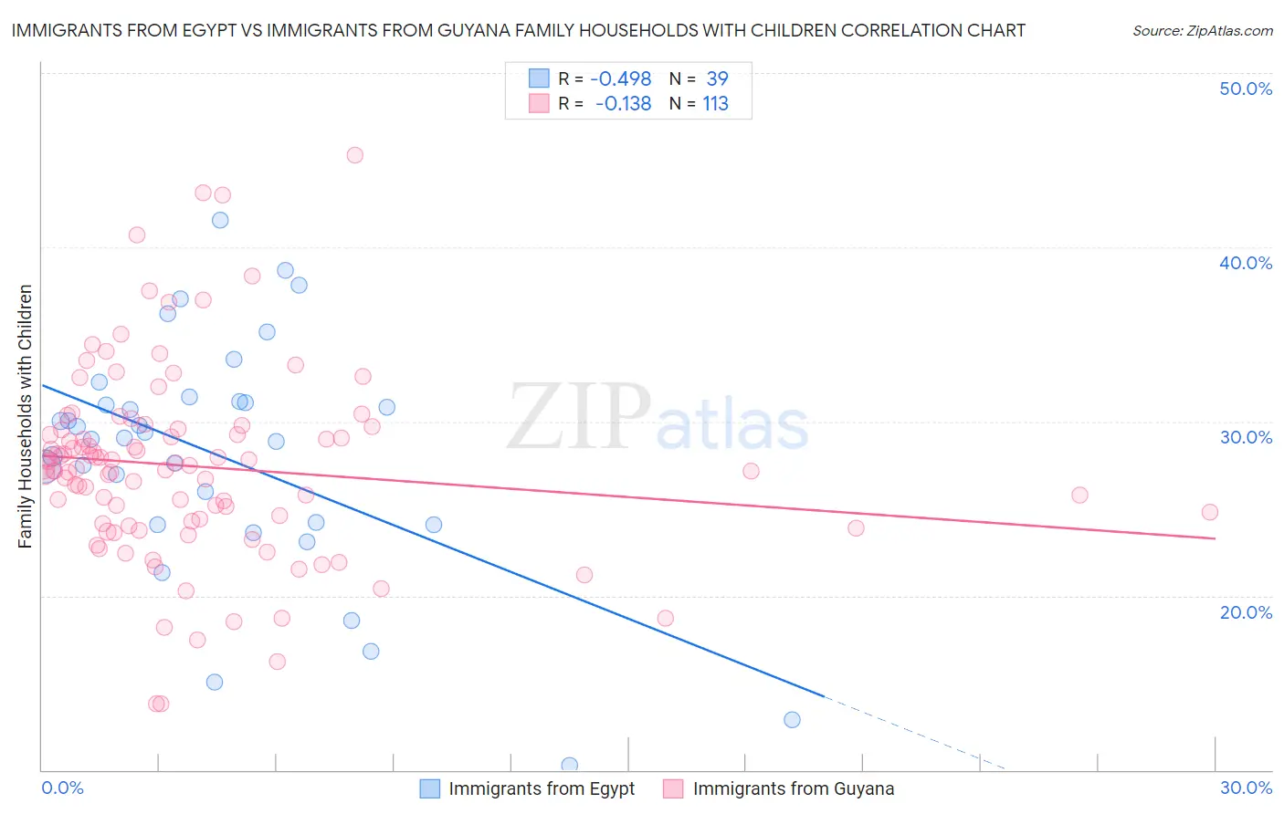 The statistical analysis conducted on geographies consisting of 245,400,532 people shows a moderate negative correlation between the proportion of Immigrants from Egypt and percentage of family households with children in the United States with a correlation coefficient (R) of -0.498 and weighted average of 28.5%. Similarly, the statistical analysis conducted on geographies consisting of 183,626,944 people shows a poor negative correlation between the proportion of Immigrants from Guyana and percentage of family households with children in the United States with a correlation coefficient (R) of -0.138 and weighted average of 26.3%, a difference of 8.3%.