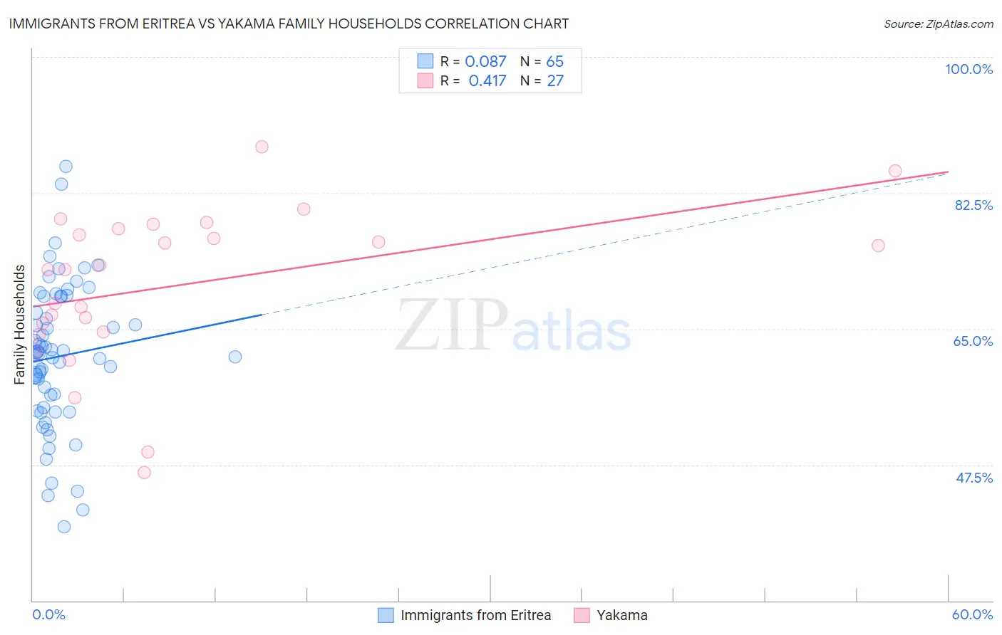 Immigrants from Eritrea vs Yakama Family Households Correlation Chart