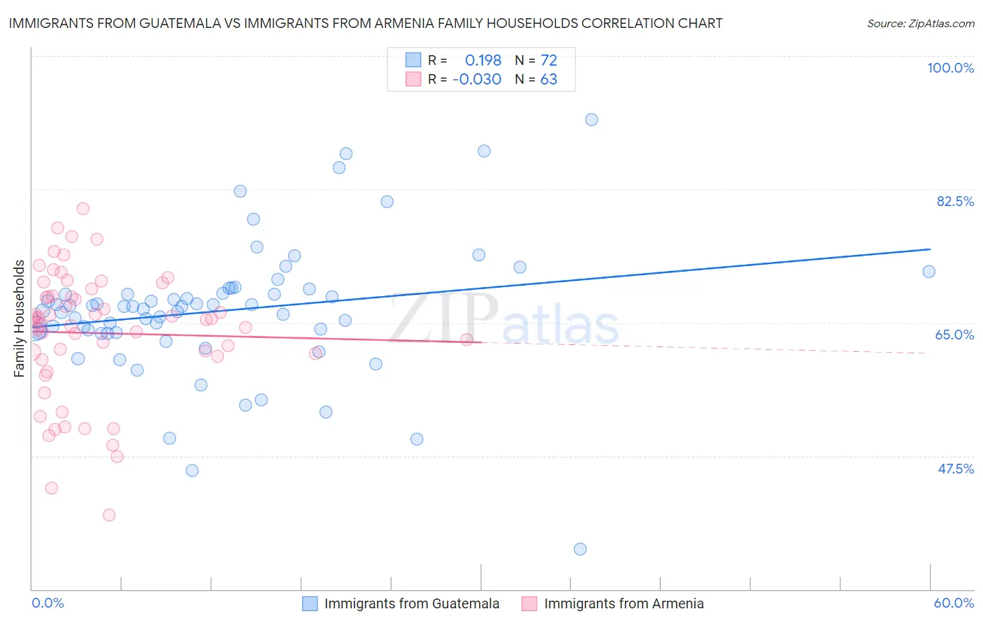 Immigrants from Guatemala vs Immigrants from Armenia Family Households Correlation Chart