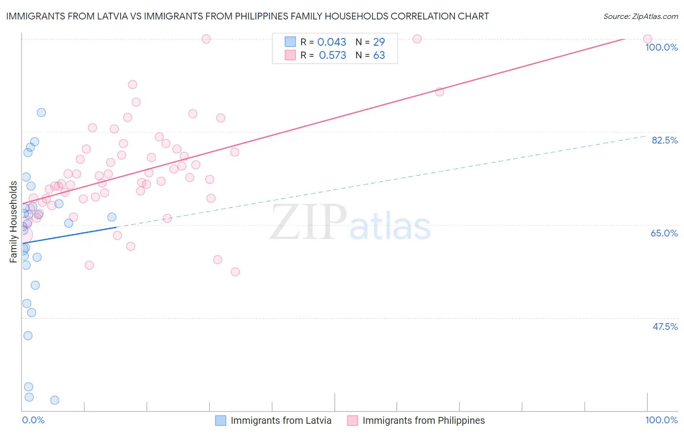 Immigrants from Latvia vs Immigrants from Philippines Family Households Correlation Chart