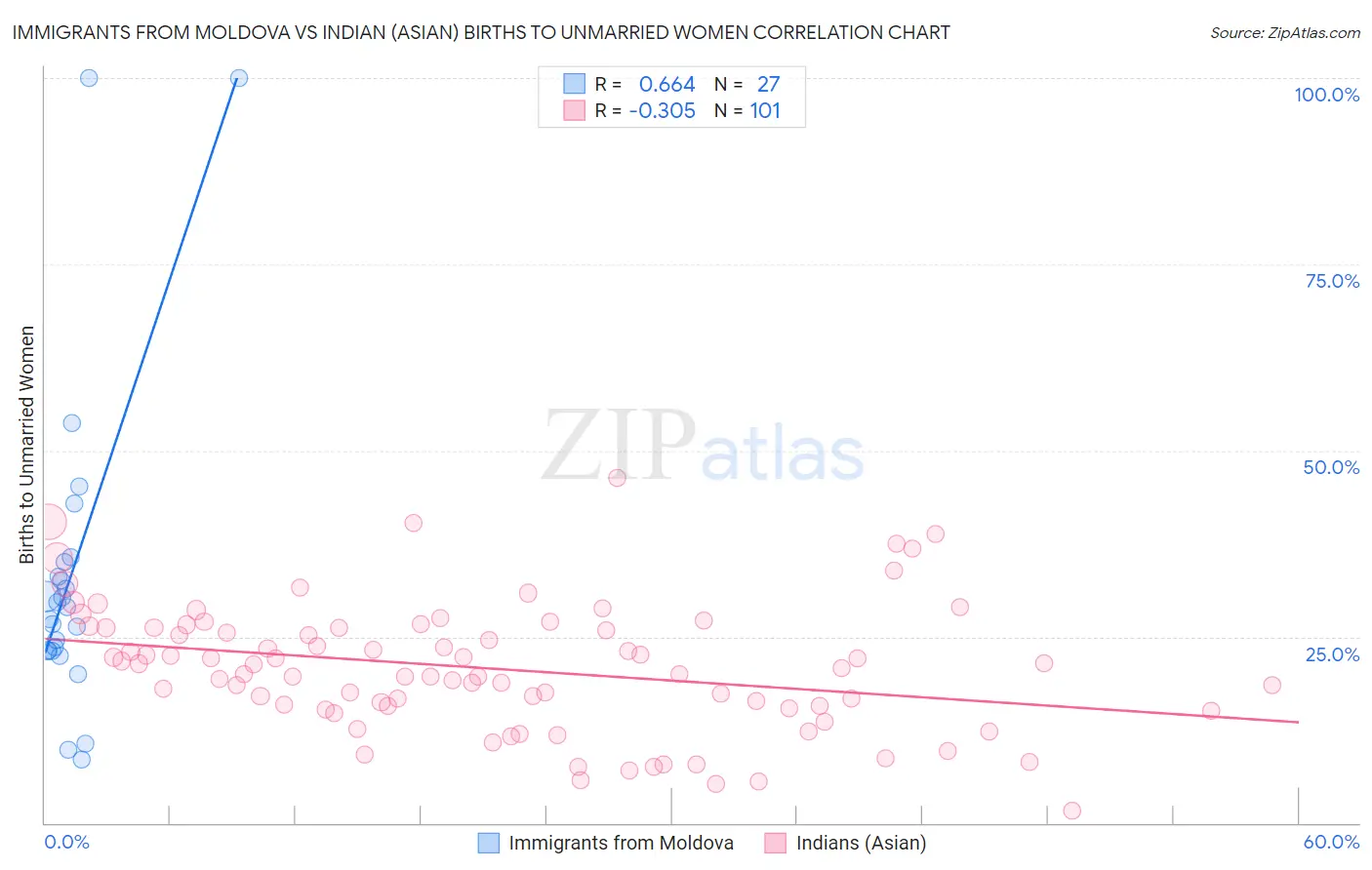 Immigrants from Moldova vs Indian (Asian) Births to Unmarried Women Correlation Chart