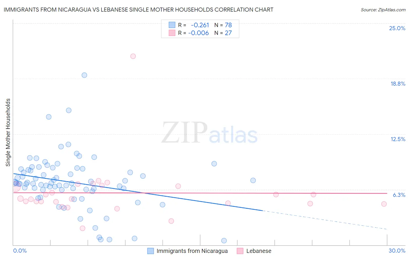 Immigrants from Nicaragua vs Lebanese Single Mother Households Correlation Chart