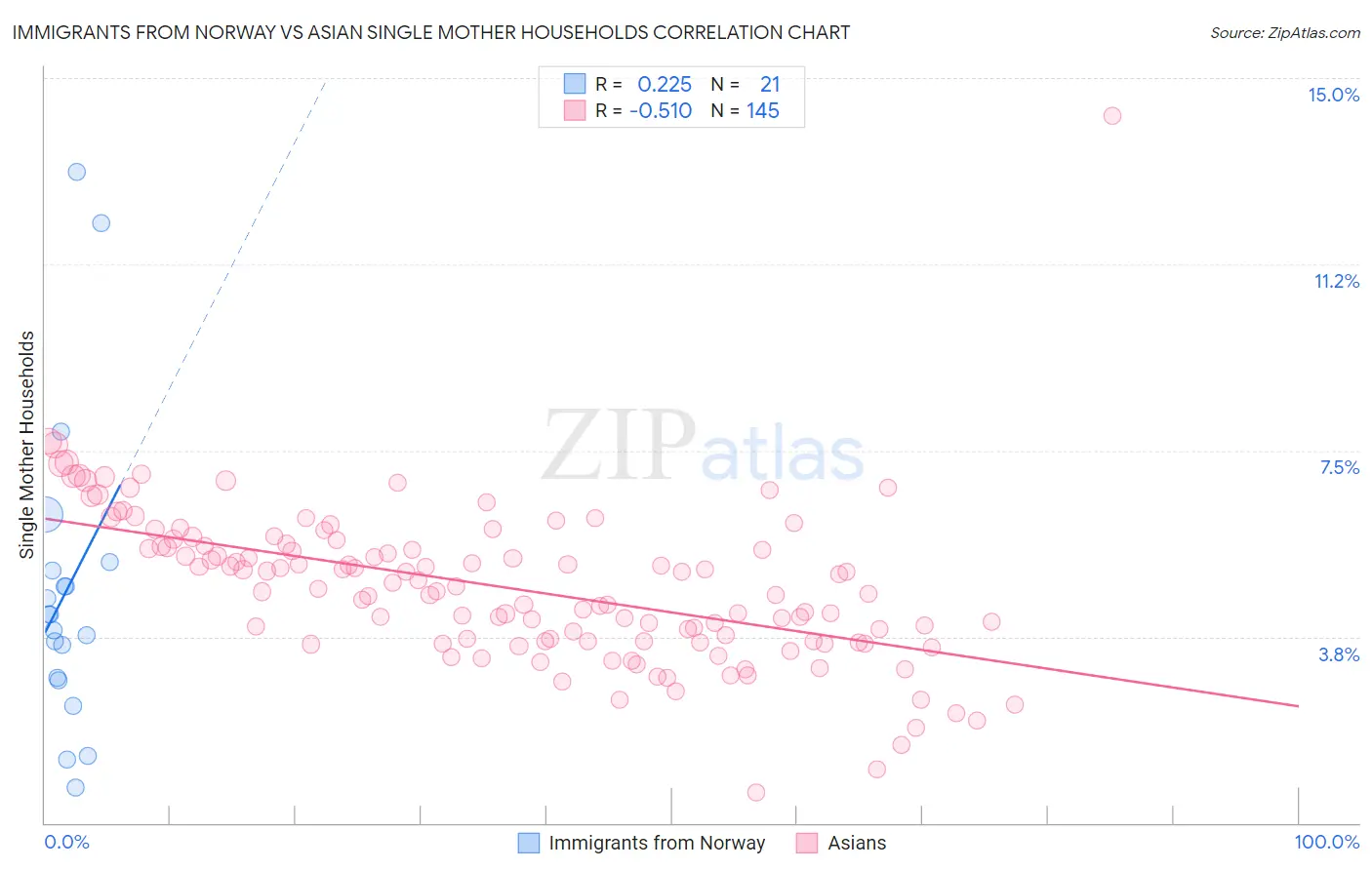 Immigrants from Norway vs Asian Single Mother Households Correlation Chart