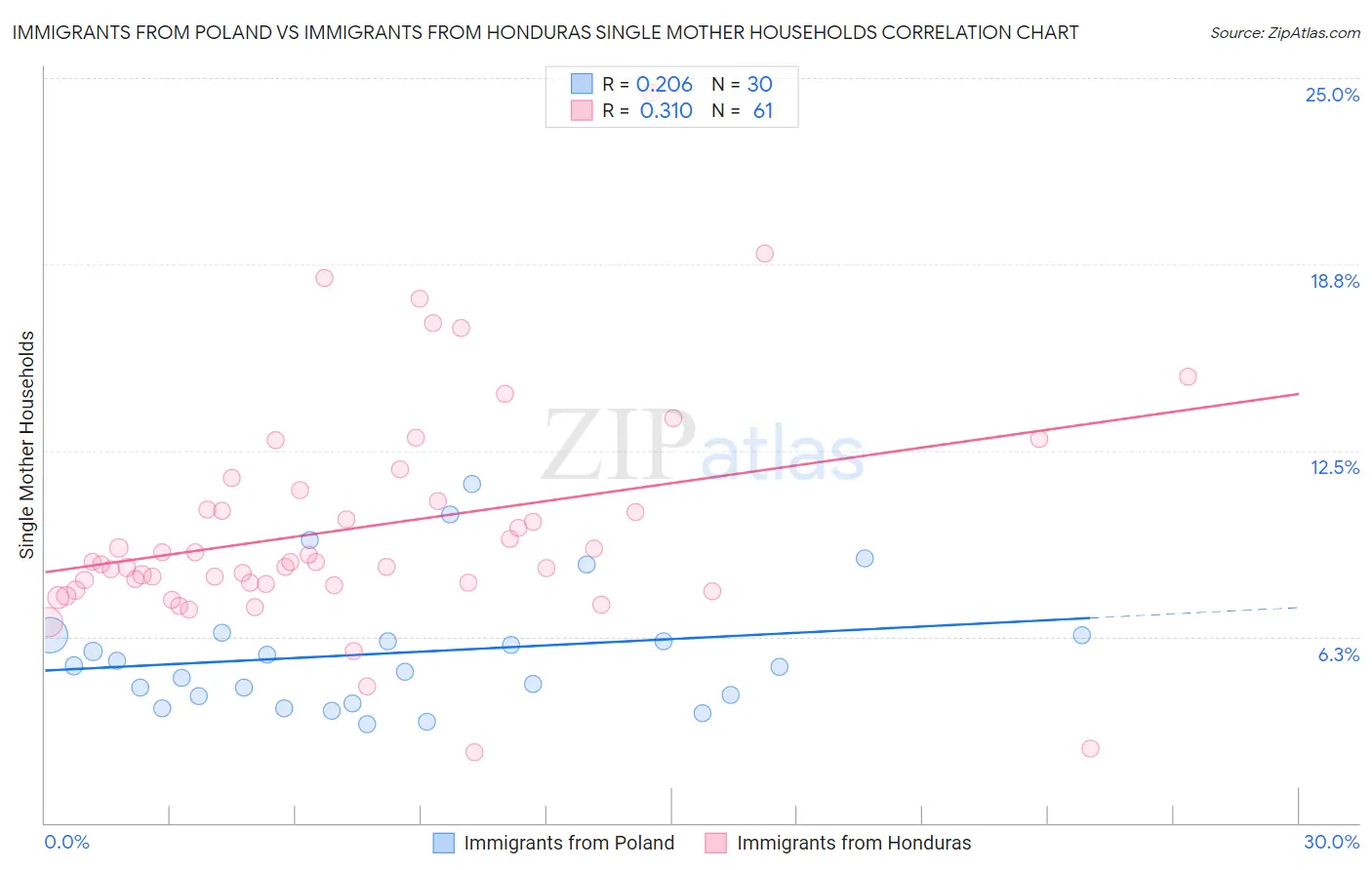 Immigrants from Poland vs Immigrants from Honduras Single Mother Households Correlation Chart