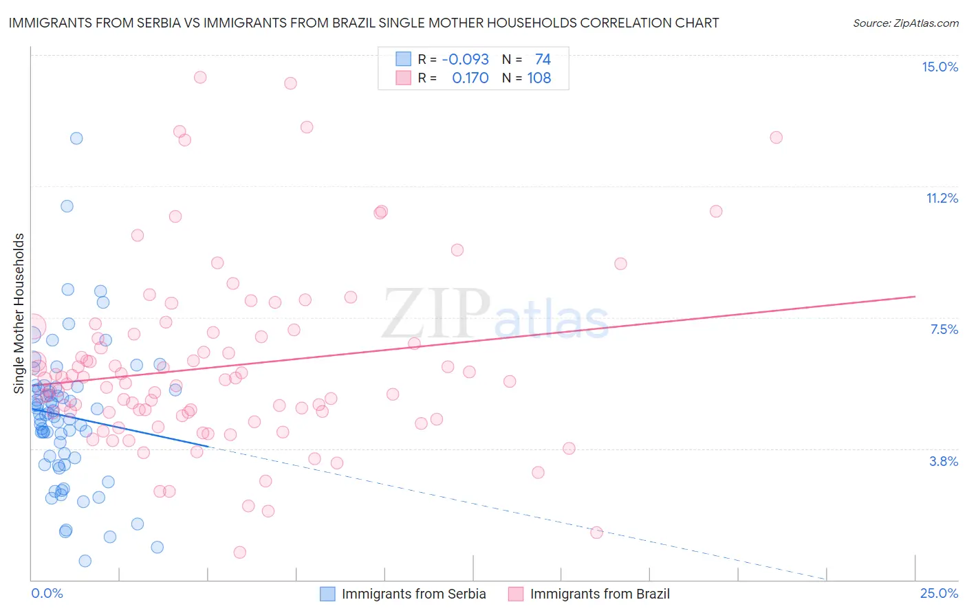 Immigrants from Serbia vs Immigrants from Brazil Single Mother Households Correlation Chart