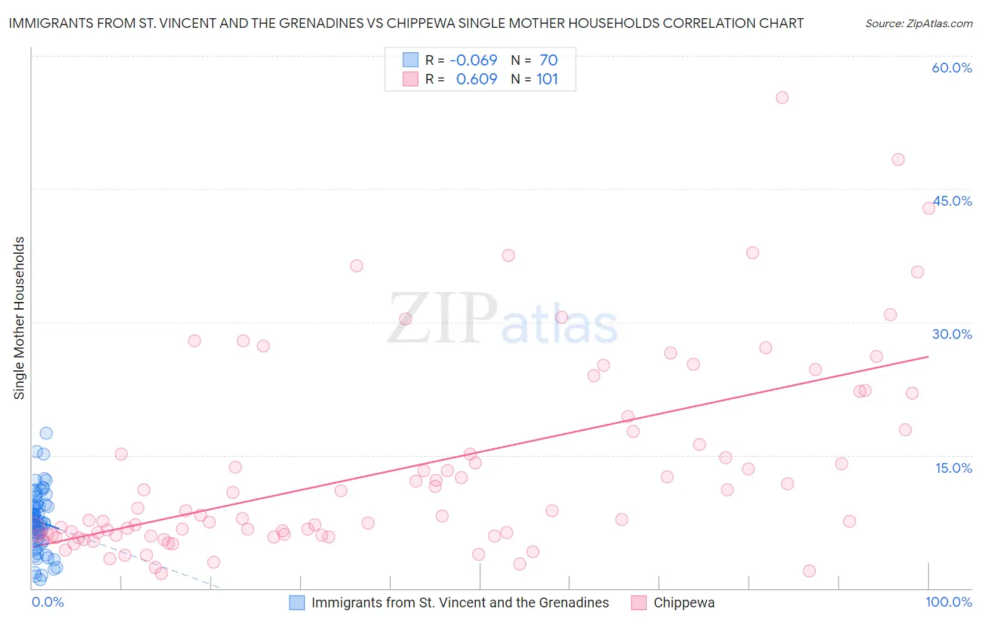 Immigrants from St. Vincent and the Grenadines vs Chippewa Single Mother Households Correlation Chart