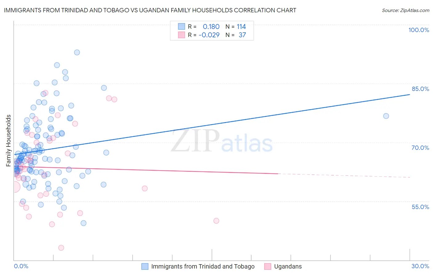 Immigrants from Trinidad and Tobago vs Ugandan Family Households Correlation Chart