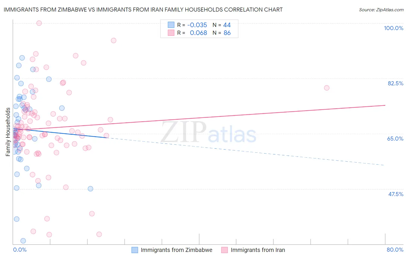 Immigrants from Zimbabwe vs Immigrants from Iran Family Households Correlation Chart