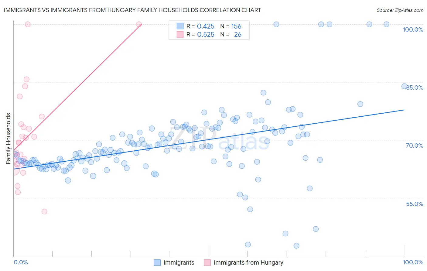 Immigrants vs Immigrants from Hungary Family Households Correlation Chart