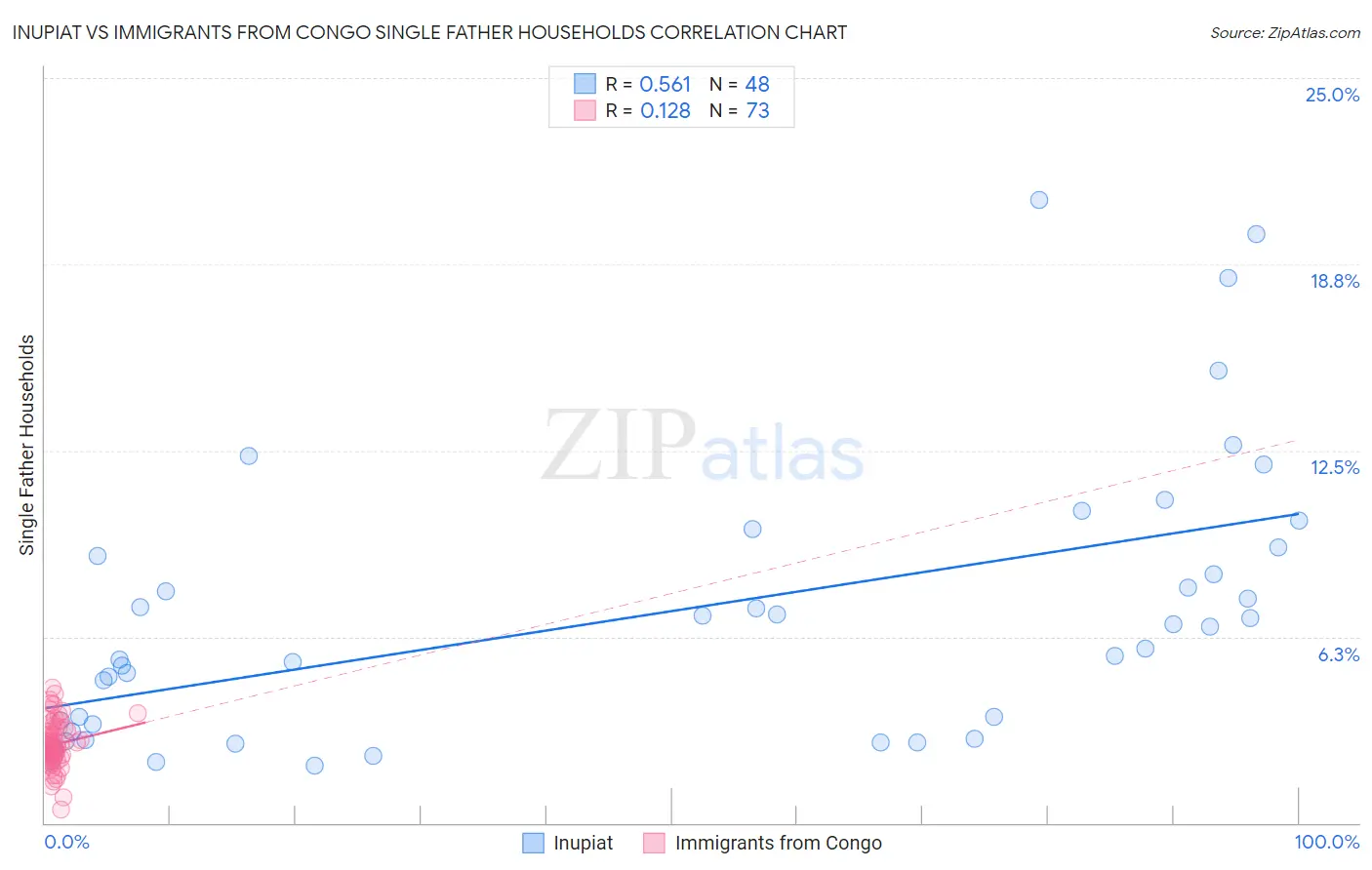 Inupiat vs Immigrants from Congo Single Father Households Correlation Chart