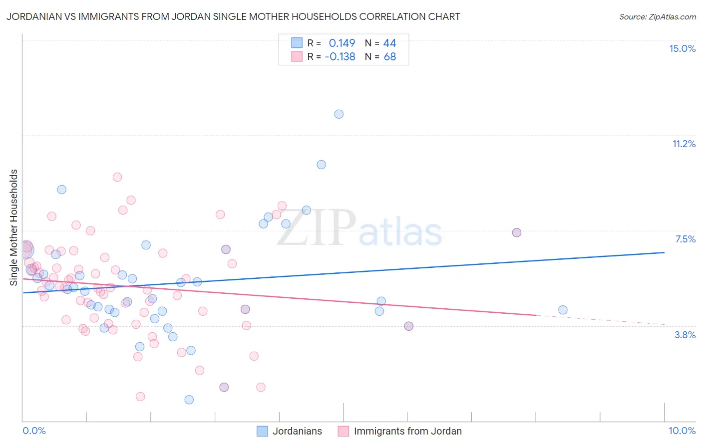 The statistical analysis conducted on geographies consisting of 166,276,124 people shows a poor positive correlation between the proportion of Jordanians and percentage of single mother households in the United States with a correlation coefficient (R) of 0.149 and weighted average of 6.0%. Similarly, the statistical analysis conducted on geographies consisting of 181,167,128 people shows a poor negative correlation between the proportion of Immigrants from Jordan and percentage of single mother households in the United States with a correlation coefficient (R) of -0.138 and weighted average of 6.0%, a difference of 1.6%.