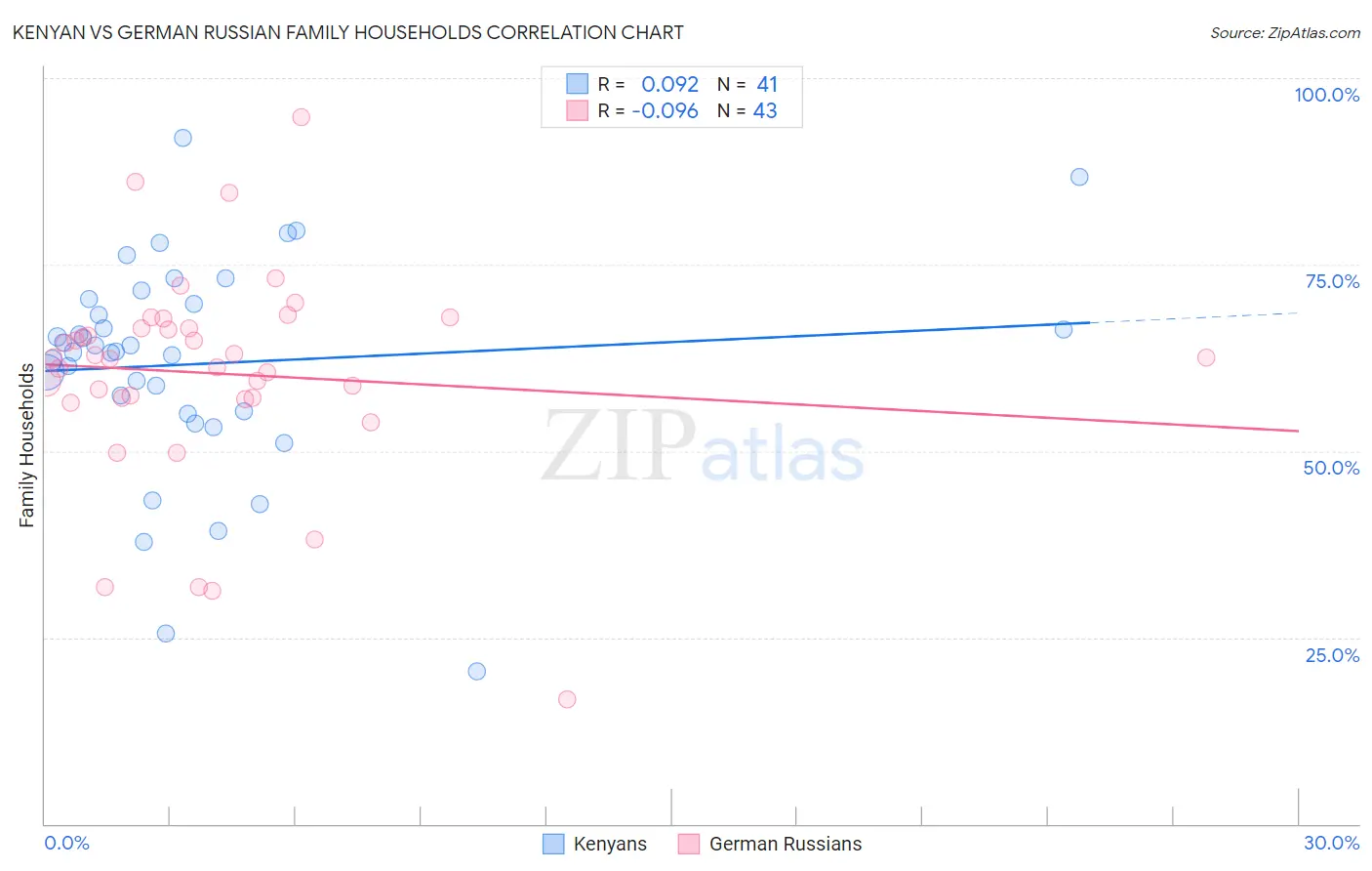 The statistical analysis conducted on geographies consisting of 168,172,574 people shows a slight positive correlation between the proportion of Kenyans and percentage of family households in the United States with a correlation coefficient (R) of 0.092 and weighted average of 63.2%. Similarly, the statistical analysis conducted on geographies consisting of 96,451,375 people shows a slight negative correlation between the proportion of German Russians and percentage of family households in the United States with a correlation coefficient (R) of -0.096 and weighted average of 60.9%, a difference of 3.7%.