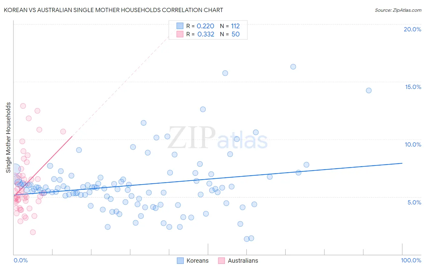 The statistical analysis conducted on geographies consisting of 508,458,058 people shows a weak positive correlation between the proportion of Koreans and percentage of single mother households in the United States with a correlation coefficient (R) of 0.220 and weighted average of 6.0%. Similarly, the statistical analysis conducted on geographies consisting of 223,630,517 people shows a mild positive correlation between the proportion of Australians and percentage of single mother households in the United States with a correlation coefficient (R) of 0.332 and weighted average of 5.6%, a difference of 8.1%.