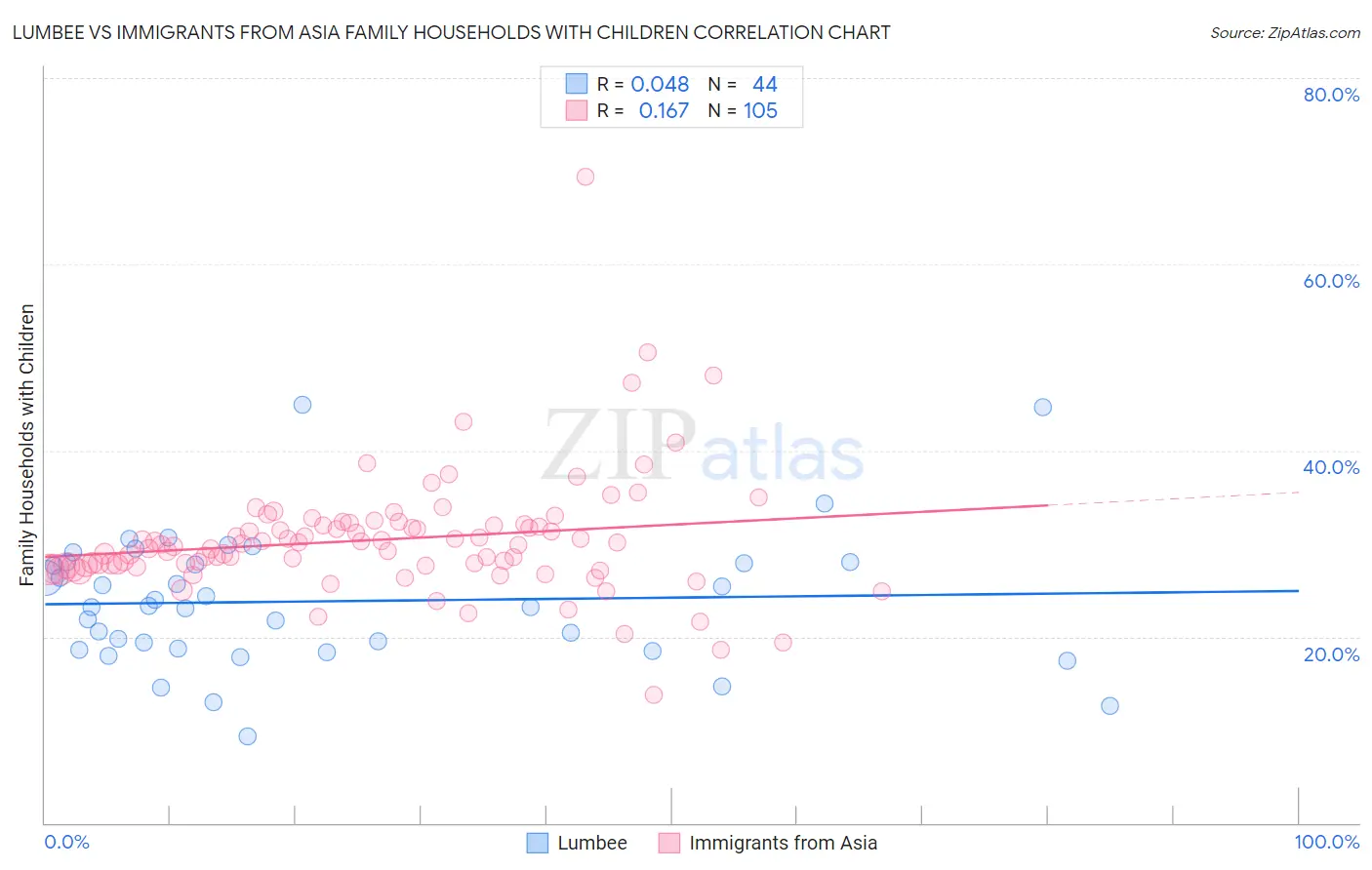 Lumbee vs Immigrants from Asia Family Households with Children Correlation Chart