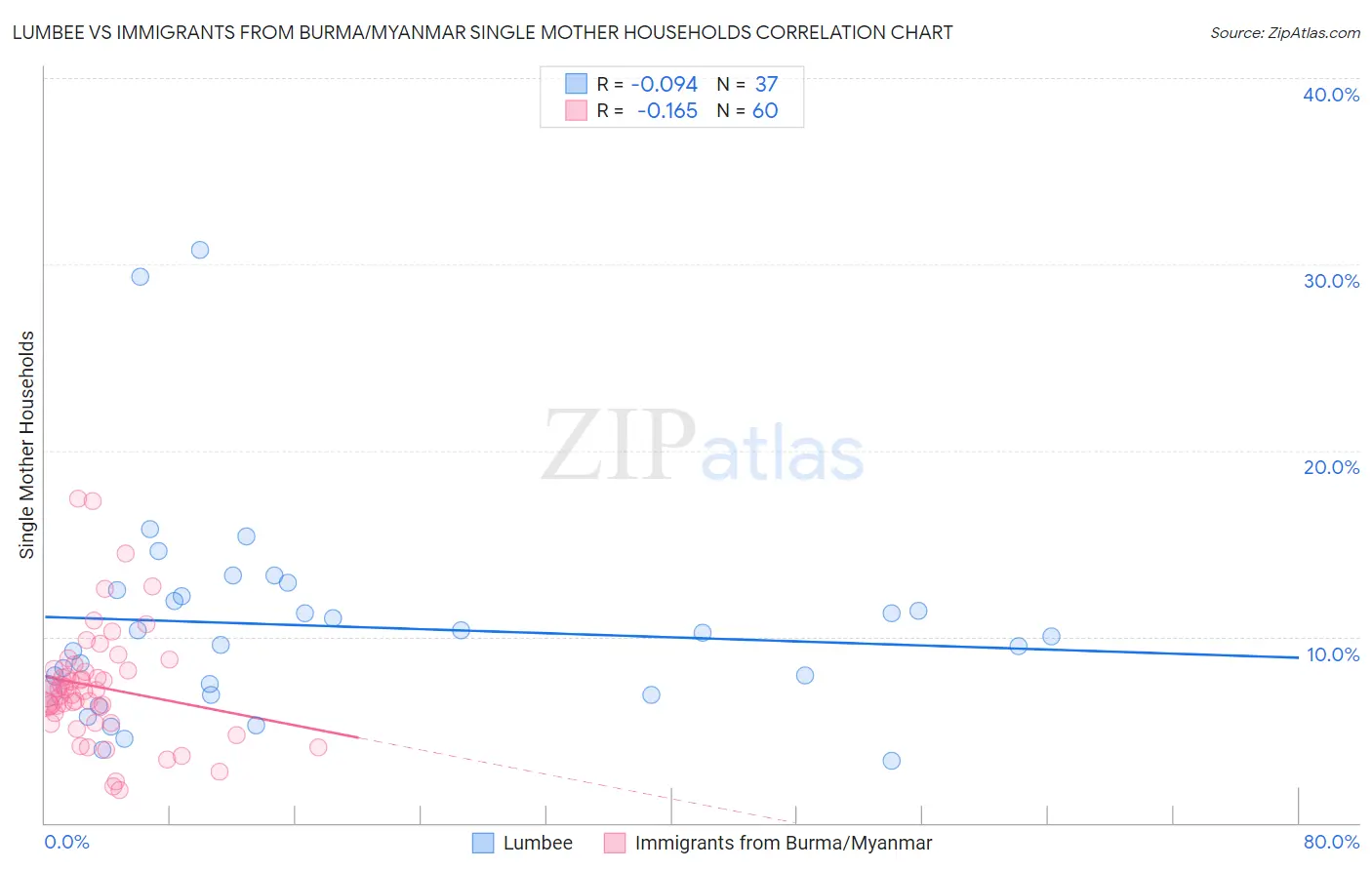 Lumbee vs Immigrants from Burma/Myanmar Single Mother Households Correlation Chart